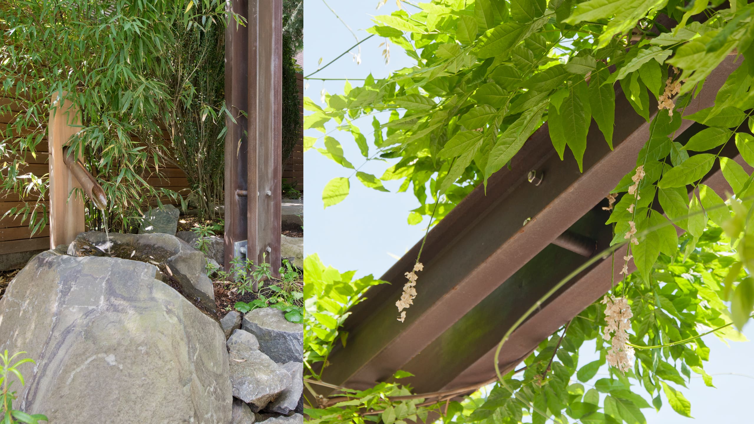The design transforms underutilized outdoor space into intimate courtyards, walking paths, and private reflective gardens for the pleasure, activities, and privacy of the client. Inviting gates, copper and concrete water features, bold street-front textures, stone walking paths, and shady sitting areas create rich transitions from street and alley to interior spaces.
